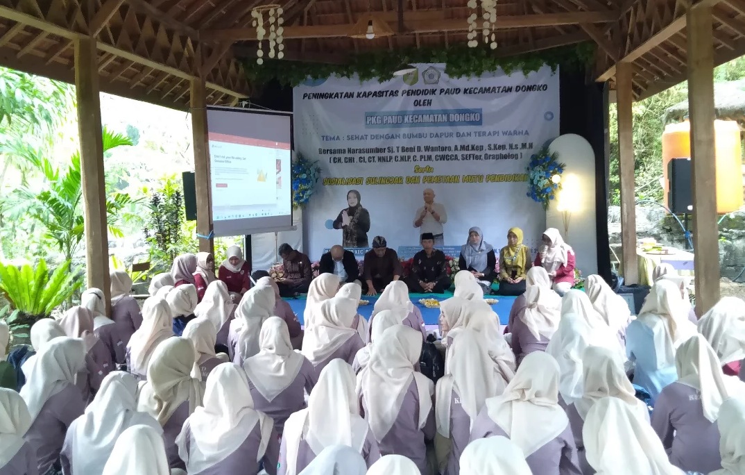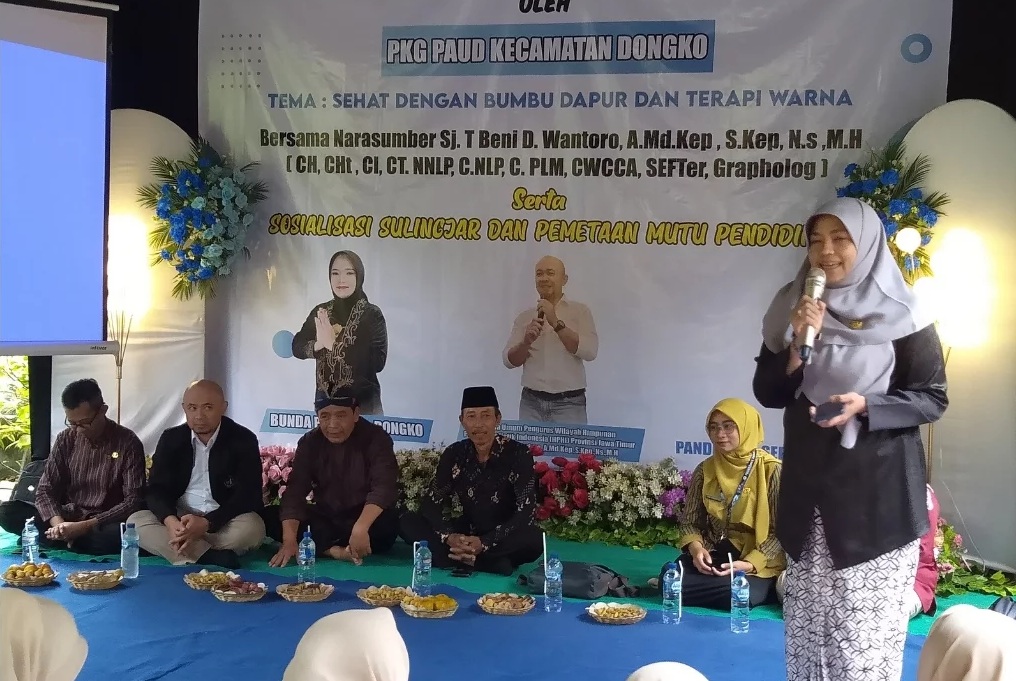Kamis, (18/9/2025) bertempat di Taman Watu Kandang Desa Pandean, Ketua Bunda PAUD Kecamatan Dongko Ibu Ariyanti Puji Astutie, S.STP hadiri dan mengikuti Kegiatan Kapasitas Pendidik PAUD oleh PKG PAUD Kecamatan Dongko dengan tema "Sehat Dengan Bumbu Dapur Dan Terapi Warna" serta Sosialisasi Survey Lingkungan Belajar (Sulingjar) dan Pemetaan Mutu Pendidikan.